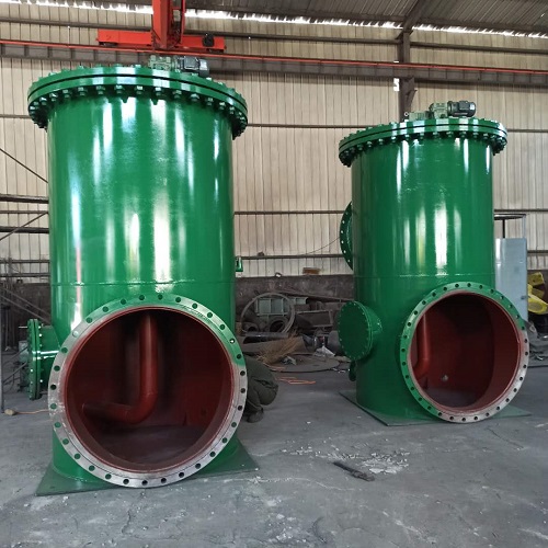 如用戶選型為自動管道濾水器,則當雜質聚積到一定數量時,利用冷卻水進出水管之間差壓信號來開啟電動排污閥,對附著在網芯內側壁面上的雜質污物反向沖洗,經由排污斗、排污管路和排污閥門排入冷卻水出水管中。排污斗步一進旋轉,依次對準球面網芯每一分格壁面,進行反沖洗。