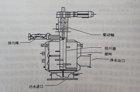 自清洗時,污水從濾水器進口進入,然后從里向外通過濾網,比網孔大的雜質被攔截下來并積累在濾網的內表面形成濾餅,這些濾餅同時能夠捕捉水中的一些更細小的雜質。自清洗過程:壓差開關持續地檢測濾網內外的壓差,當達到預設值時將傳遞信號到控制箱啟動清洗循環;濾水器的清洗機構是作螺旋式上下運動的吸污器,它是空心結構,在它的軸線上按一定距離垂直均勻分布著若干個吸污管;吸污器與一個排污閥相通,在排污閥打開時,濾水器內部水壓與外部大氣之間形成的壓差使吸污管產生強勁吸力,水流從濾網外向內反向高速流動將雜質沖下來,雜質進入吸污器通過排污閥排出;吸污器由一個連有絲桿裝置的雙向電機驅動,按照固定的轉速作螺旋式的運動,這樣多個吸嘴就能吸遍整個濾網內表面,這個過程大約需要半分鐘;在整個反清洗過程中,系統不斷流,過濾器的整個運行由程序控制器(PLC)來控制完成。
