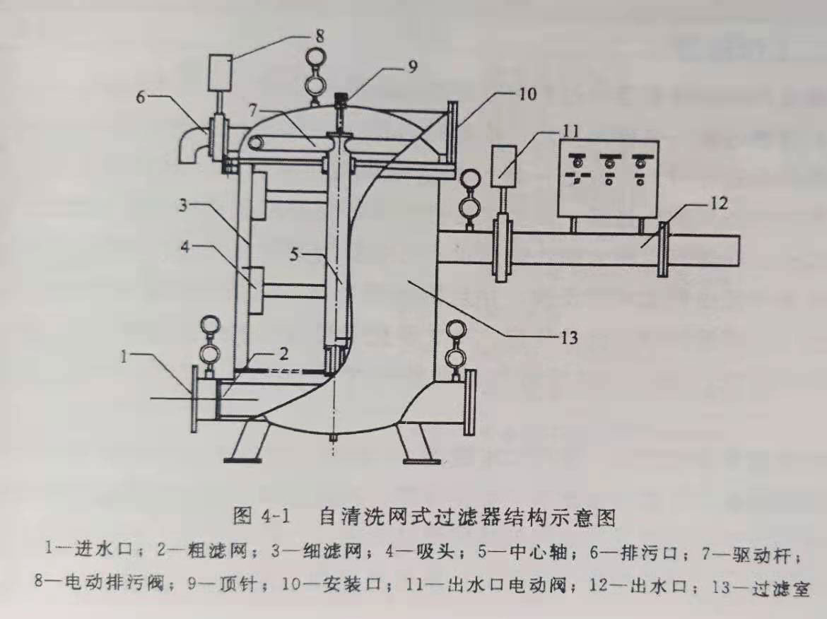 由結構圖所知,自清洗網式過濾器主要由進水口、粗濾網、細濾網、吸頭、中心軸、排污口、驅動桿、電動排污閥、頂針、安裝口、出水口電動閥、出水口、過濾室等部分組成。